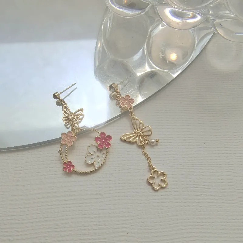 Boucle d’Oreille Papillon Fleurs Asymétriques boucles d’oreilles asymétriques en forme de papillon et de fleur. Chaque paire se compose d’une boucle longue pendante et d’une autre boucle avec une délicate fleur