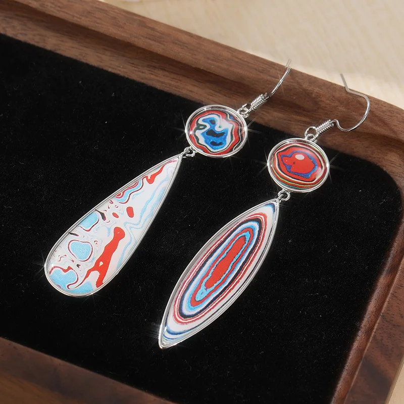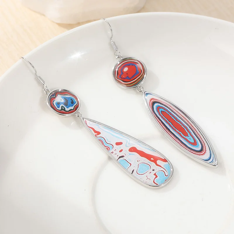 boucles d’oreilles asymétriques sont un véritable coup de cœur pour les amatrices de style bohème et vintage. Conçues dans un style artistique et audacieux, elles se composent de deux formes différentes : une larme allongée et un ovale fuselé, toutes deux suspendues à une base ronde. Les deux boucles ne sont pas identiques, ce qui renforce leur côté original et fait-main. Ce modèle fait partie de notre collection de boucles d’oreilles asymétriques, une tendance forte pour affirmer son style avec originalité. Les motifs tourbillonnants multicolores (rouge, bleu, blanc, noir) rappellent des peintures marbrées ou des pierres naturelles polies, avec un effet psychédélique très stylé. Elles mesurent 7 cm de long pour 1,5 cm de large, et pèsent 16 g chacune, un poids équilibré pour un bon maintien sans gêne. Montées sur des crochets métalliques type acier, elles sont idéales pour oreilles non sensibles. Leur finition lisse et brillante leur donne un aspect à la fois vintage, bohème et artistique. ✔️ Points clés :