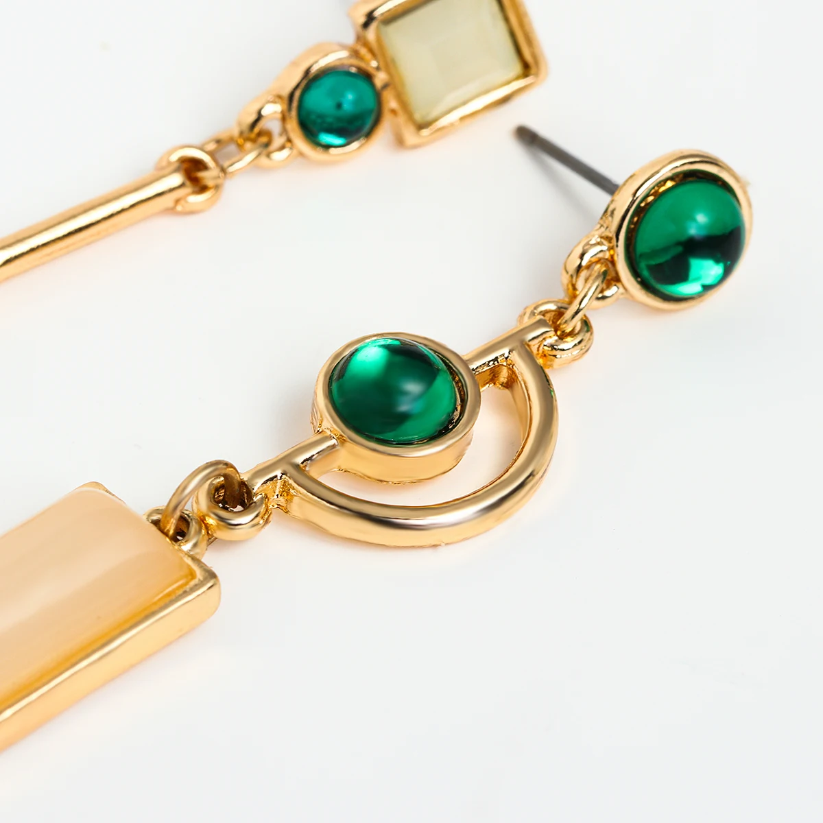 Boucles d’oreilles asymétriques strass vert et blanc boucle dépareillée formes de cercle et carré et rectangle avec motifs inversés