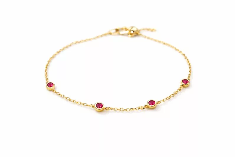 Découvrez le bracelet fin chaîne dorée Ava avec perles rouges en zircon. Bijou fin et élégant plaqué or, idéal pour un look chic et discret.