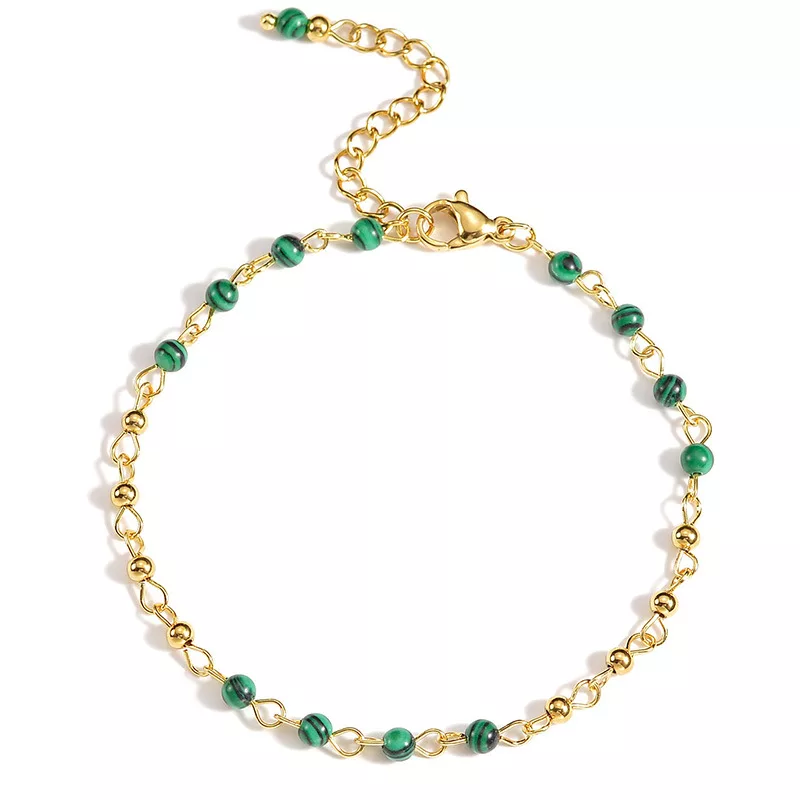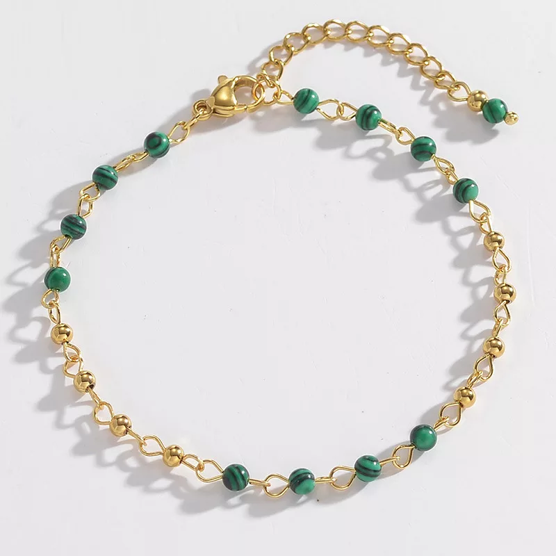 Bracelet EMA en acier inoxydable doré avec perles vertes. Léger, ajustable, chic et féminin. Idéal pour un look discret ou superposé.