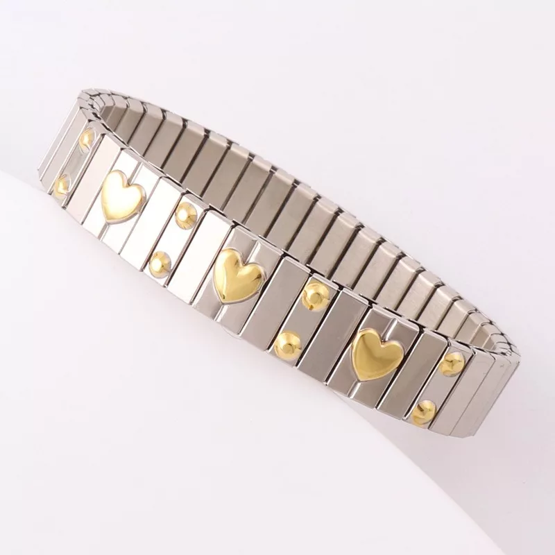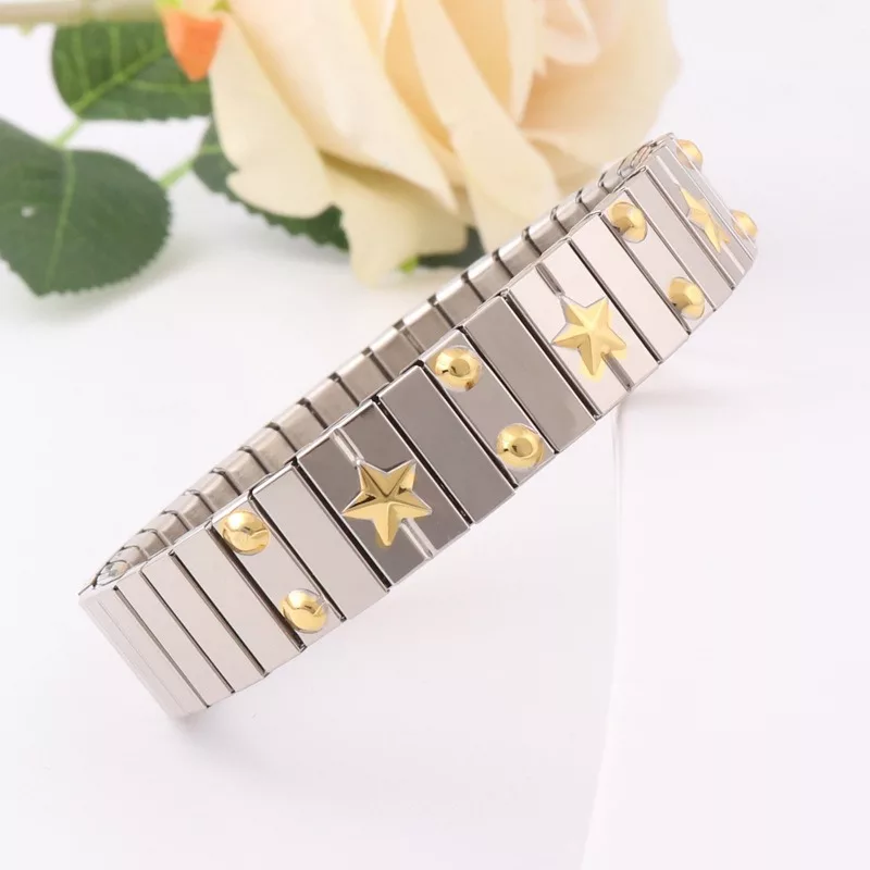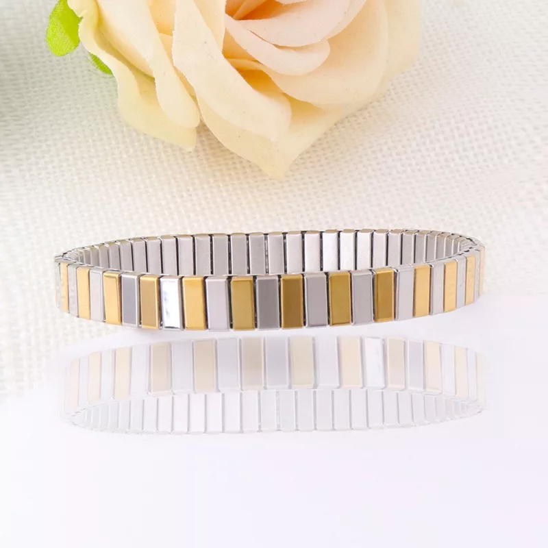 Bracelet extensible unisexe JAY en acier inoxydable. Design bicolore avec motifs dorés, confortable et sans fermoir. Style moderne, ne ternit pas.