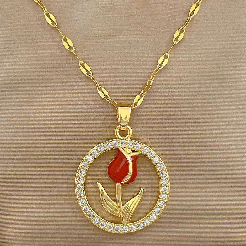 Collier acier inoxydable doré : Élégance Intemporelle avec Pendentif Rose Ajoutez une touche de délicatesse à votre style avec notre collier en acier inoxydable doré, orné d’un pendentif rose rouge. D’un diamètre de 2.7 cm, ce pendentif est subtilement encadré dans un cercle, accentuant son charme naturel.