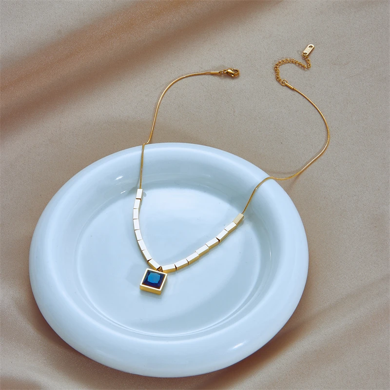 Collier en acier pendentif carré bleu Ce collier raffiné allie simplicité et sophistication, avec un pendentif géométrique qui attire le regard.