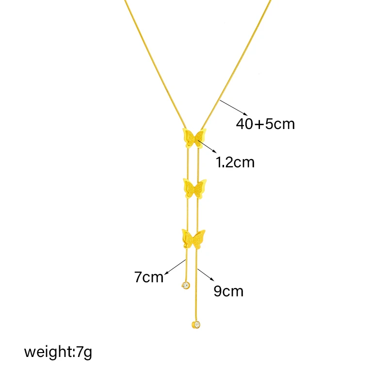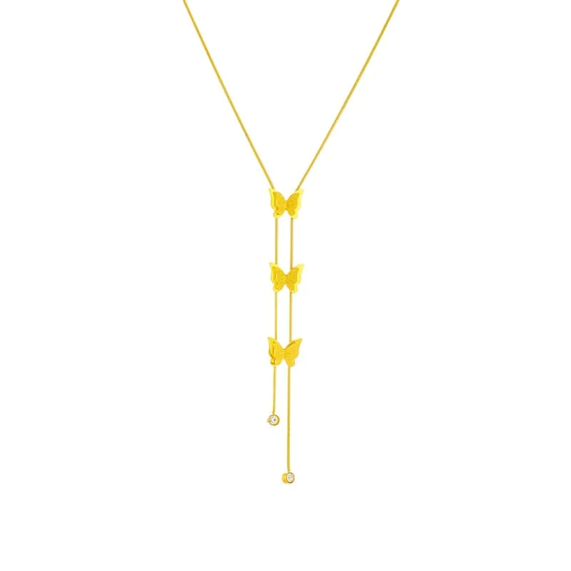 Collier Papillons Verticaux en Acier Inoxydable : Légèreté et Élégance Découvrez la légèreté et l’élégance incarnées dans notre collier en papillons en acier inoxydable. La délicate chaîne en acier inoxydable doré ajoute une touche de sophistication, tandis que les trois papillons suspendus en pendentif créent un design vertical unique.