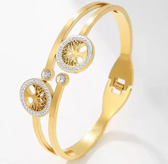 Bracelet jonc arbre de vie double en acier inoxydable doré. Ce jonc ouvrant est orné d’un délicat arbre de vie, symbole de force et de croissance,